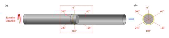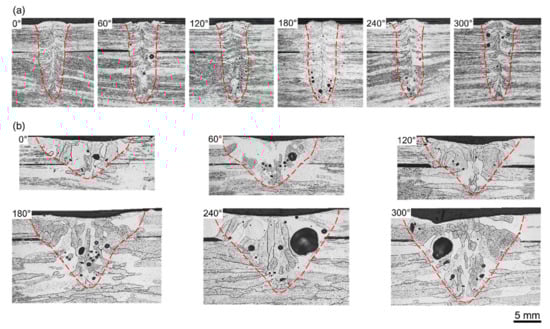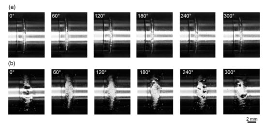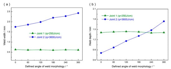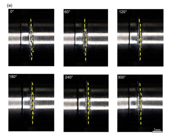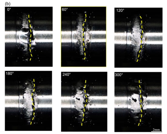 As shown in Figure 4, for the description, the circumference of the socket joint was divided into six parts. Here, the position of 0° indicates the welding start position and the welding direction is indicated by the curved red arrow in Figure 4a. Welding tests were conducted following the parameters given in Table 1 and the surface morphologies of the socket joints achieved under these welding conditions are presented in Figure 5. Figure 6a,b shows cross-sections of Joint 1 and Joint 2, respectively. The width and depth of the welded seams are shown in Figure 7a,b, respectively.