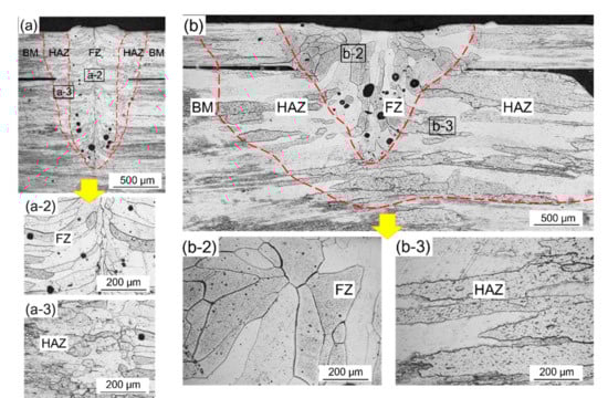 The cross-sectional microstructures of the NS Mo alloy laser welding joints. Heat input: (a) 250 J/cm; (b) 3600 J/cm.