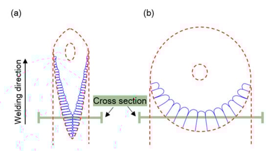 Comparison of the solution direction for columnar grain in fusion zone between: (a) high welding speed; (b) low welding speed.