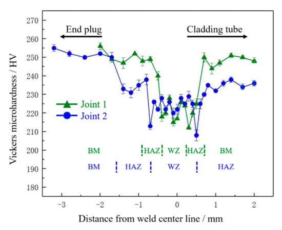 The microhardness distributions on the cross-sections at 180° were tested along the paths indicated in Figure 2c, and the results were presented in Figure 10. From Figure 10, it can be found that the microhardness of the BM was 250~260 HV, the heated zones of both joints 1 and 2 were softened and the minimum hardness on the cross-sections of these joints always appeared at the FZ-HAZ interface. The results also indicated that the width of the softened zone of joint 1 was greatly less than that of joint 2, while the minimum hardness of the former was slightly higher than that of the latter. For NS Mo base metal, a special liquid liquid mixing preparation method was employed to realize the dispersed distribution of nano-sized La2O3 particles, resulting in favorable mechanical performance. Owing to the melting point of La2O3 (i.e., 2207°C) [] being lower than that of Mo (i.e., 2622 °C, La2O3 particles in the FZ will decompound during the laser welding process. Thus, the microhardness of the FZ was significantly decreased and lower than those of the HAZ and BM. The NS Mo BM considered in this work is also a type of work-hardened material. Therefore, softening of the HAZ in the welded joints might be largely due to the decreased number of dislocations after the welding thermal cycle.
