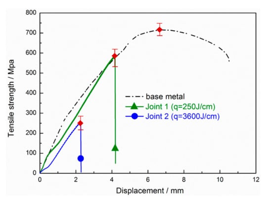 Tensile stress displacement curve of NS Mo base metal and its laser welding joints.