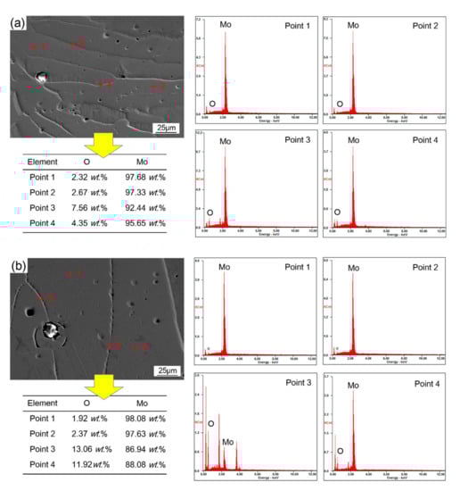 As mentioned in Section 3.4, the La2O3 particles in the FZ might decompound during fusion welding, which would cause O to dissolve into a molten pool and react with Mo. Thus, MoO2 was generated and had a great probability to gather on GBs, due to its lower melting point (2300 °C). Previous research already showed that the discontinuous distribution of MoO2 at the GBs of the FZ was the main reason causing a reduction of the strengths of Mo alloy joints []. In this work, oxygen segregation at GBs in the FZ was also investigated and is presented in the next subsection. Of course, the numbers of porosity defects and pore sizes in the FZ of joint 2 were larger than those of joint 1 respectively, which is also an important reason why the tensile strengths of joint 2 was significantly lower than that of joint 1.