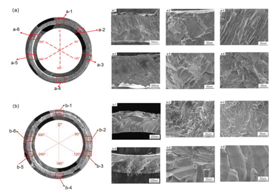 Figure 15 displays the morphologies of tensile fractures of joints 1 and 2 observed by using SEM. The fractures of the two joints all appeared as intergranular and transgranular mixed fracture morphology. The river-like patterns were observed at the 0°, 60°, 120° and 300° positions of the fracture of joint 1 (as shown in Figure 15a), namely, shown as cleavage fracture, which took up about 70% of the total area of the fracture. In the fracture zone of joint 1 at 80° and 140°, the grain surface exposed due to the intergranular fracture occurred there, which accounted for about 30% of the total area of the fracture. The river-like pattern occurred at the 30° and 90°positions on the fracture of joint 2 (as shown in Figure 15b), which accounted for about 50% of the total area of the fracture. Intergranular fracture morphology took up about 50% of the total area of the fracture of joint 2, which should be attributed to the serious MoO2 segregate on GBs in the FZ of joint 2. As mentioned above, higher heat input would result in coarsened grains and reduce the total area of the grain boundary, which would consequently cause excessive aggregation of MoO2 on GBs and weaken grain boundary strength. Therefore, the tensile strength of joint 2 was obviously lower than that of joint 1.