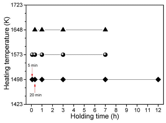 The cylindrical steel sample with a 34 mm diameter was taken from the tundish and quenched in water. The quenched steel sample was machined into sectors (each measuring approximately 17 mm × 10 mm with an angle of 60°), as shown in Figure 1. Next, the machined samples were heated under an argon atmosphere at 1498, 1573, or 1648 K for various periods from 5 min to 12 h, respectively, in a Si-Mo resistance furnace (SHIMADEN FP21, Tokyo, Japan), followed by water quenching. The schematic of experimental procedures is shown in Figure 2.