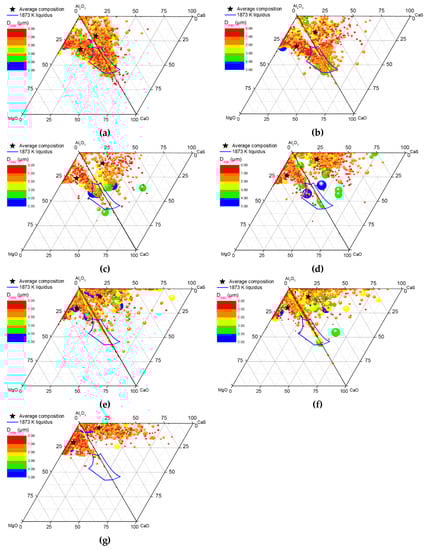 Composition and size of inclusions in steel samples: (a) Before and after heat treatment at 1498 K for (b) 5 min, (c) 20 min, (d) 1 h, (e) 3 h, (f) 7 h, (g) 12 h.