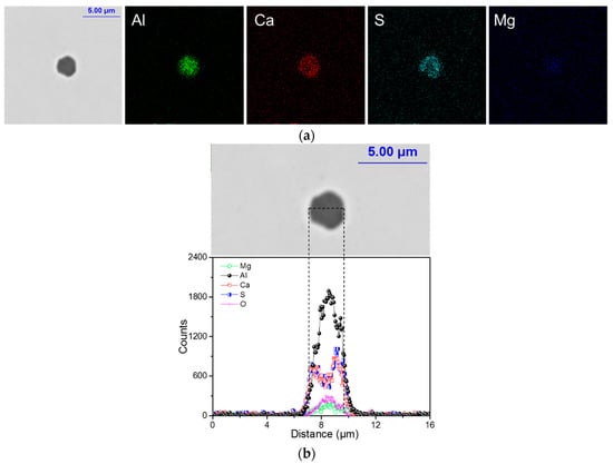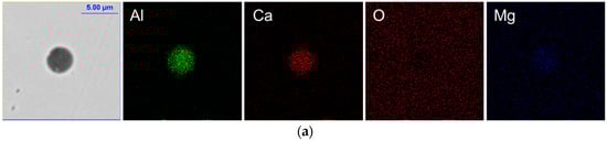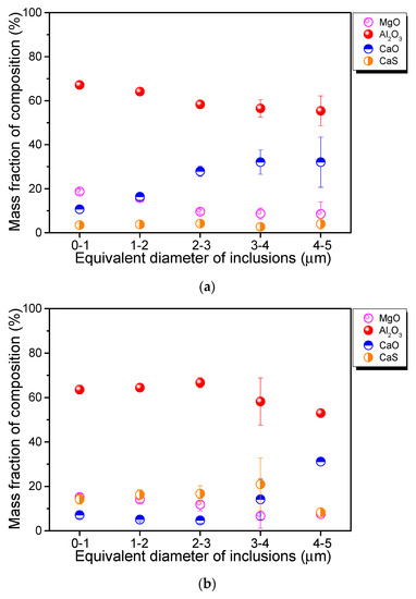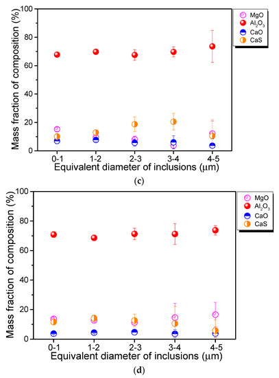 The evolution of the average content of each component in the inclusions as a function of the inclusion diameter is shown in Figure 8. According to Figure 8a, before heat treatment, inclusions larger than 3 μm were mainly calcium aluminate. As for inclusions smaller than 3 μm, the CaO content increased with the increase of the diameter, and the contents of Al2O3 and MgO decreased.