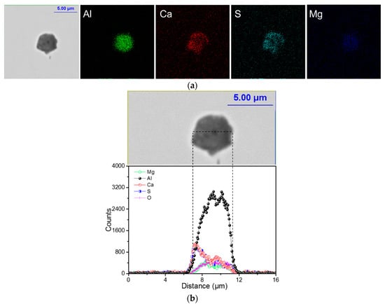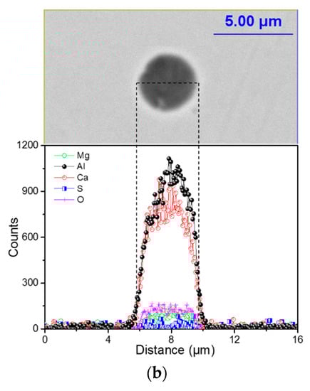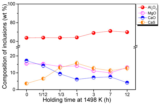 The composition and size of the inclusions in the steel before and after the heat treatment at 1498 K with varied holding time are shown in Figure 3. As shown in Figure 3a, the inclusions were mainly MgO·Al2O3 and Al2O3-CaO-(MgO) which represents Al2O3-CaO with limited MgO content, before heat treatment. A typical inclusion with mapping and line scanning is shown in Figure 4. The average composition of inclusions was 15.42 wt % MgO-63.76 wt % Al2O3-17.18 wt % CaO-3.64 wt % CaS. According to Figure 3b, after being annealed at 1498 K for 5 min, the average content of CaO in the inclusions decreased while the CaS content slightly increased. After 20 min, the average content of CaO in the inclusions decreased from 17.18 to 9.36 wt % while the CaS content increased from 3.64 to 13.06 wt %, as shown in Figure 3c. Figure 5 shows a typical inclusion in the steel after being held at 1498 K for 1 h, which was the MgO-Al2O3 core enveloped by CaS. The average composition of inclusions in the steel had no obvious change when the holding time was longer than 3 h, according to Figure 3e–g. The average composition of the inclusions in the steel after being held at 1498 K for 12 h was 13.20 wt % MgO-69.94 wt % Al2O3-4.12 wt % CaO-12.73 wt % CaS. An irregular shaped MgO-Al2O3-CaS inclusion was observed after the steel was held at 1498 K for 12 h, as shown Figure 6, which was MgO-Al2O3 in the core and CaS in the periphery. Wang et al. investigated the effect of CaS on the evolution of CaO-Al2O3 inclusions in low-carbon Al-killed and Ca-treated steels during the solidification process [7]. It was found that the inclusions were originally liquid and spherical, and transformed to an irregular state during solidification due to the reaction between CaO-Al2O3 inclusions with the dissolved sulfur and aluminum in the steel, resulting in the formation of dense CaS shells around the inclusions. The effect of the holding time on the average composition of inclusions at 1498 K is shown in Figure 7. It indicates that inclusions are transformed from Al2O3-CaO-(MgO) to Al2O3-CaS-(MgO-CaO). Error bars represented the 95% confidence interval of the mean composition.