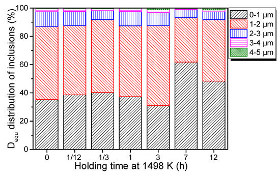 The variation in the size distribution of the inclusions in the steel against the holding time is shown in Figure 11. The number of small inclusions increased after heat treatment at 1498 K, especially heat treatment of 7 and 12 h. Less variation in the area fraction of the inclusions in the steel with holding time was observed. The results are shown in Figure 12.
