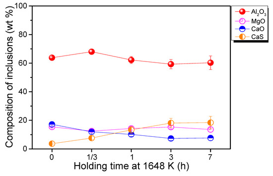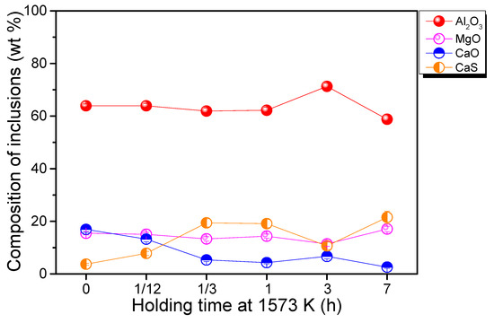 The effect of holding time on the average composition of the inclusions in the steel during heat treatment at 1573 K is shown in Figure 13. After heating for 5 min at 1573 K, the average content of CaS in inclusions increased while the CaO content slightly decreased. The average content of CaO in inclusions decreased from 17.18 wt % to 5.33 wt % and the CaS content increased from 3.64 wt % to 19.41 wt % after heating for 20 min at 1573 K. The average composition of inclusions slightly varied after heating for 1 h or longer at 1573 K. The average composition of inclusions in the steel after heating for 7 h at 1573 K was 17.10 wt % MgO-58.77 wt % Al2O3-2.60 wt % CaO-21.53 wt % CaS. The CaS content of inclusions increased and the CaO content decreased with time at 1573 K.