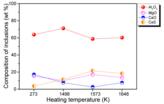As shown in Figure 22, the initial inclusions in the steel were mainly Al2O3-CaO-(MgO) and MgO·Al2O3 before heat treatment. During heat treatment, the high temperature accelerated the diffusion of elements in the steel matrix such as [Al] and [S]. Reactions between [Al] and [S] in the steel matrix and [Ca] and [O] in Al2O3-CaO-(MgO) inclusions were promoted, which were expressed by Equations (3)–(5). Besides, MgO·Al2O3 phases were formed by the reaction between Al2O3 and MgO inside inclusions, as shown in Equation (6). The initial MgO·Al2O3 inclusions in the steel before heat treatment did not transform during heat treatment. After the steel was heated at a high temperature for a long time, the inclusions in the steel were mainly MgO·Al2O3 and MgO·Al2O3 enveloped by CaS. It should be pointed out that Equations (3)–(6) appeared to dominate during heat treatment at 1498 K, resulting in the increase of Al2O3 and CaS, as well as the decrease of CaO. However, Equations (3), (4), and (6) seemed to dominate during heat treatment at 1573 and 1648 K, only leading to the increase of CaS and the decrease of CaO.