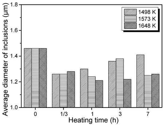 The variation in the number density and average diameter of the inclusions in the steel are shown in Figure 9 and Figure 10, respectively. The number density of inclusions varied slightly with time when the steel was held at 1498 K. The average diameter of the inclusions in the steel decreased after heating, especially after 12 h heat treatment at 1498 K.