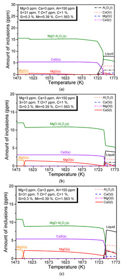 For the steel with 7 ppm T.O. (total oxygen content), which was used in the current experiments, the precipitation of inclusions in the bearing steel at various temperatures with consideration of steel was calculated using FactSage 7.0 with the FactPS, FToxid, and Fsstel databases. The result is shown in Figure 18. Due to the similarity of transformations under different conditions according to Figure 18, only the comprehensive transformation of inclusions in the bearing steel is illustrated in detail. As shown in Figure 18a, at the initial decreasing of temperature, inclusions in the bearing steel are liquid oxides and solid MgO·Al2O3 ones. As the temperature decreases, the amount of spinel phase increases and a small amount of solid MgO inclusions forms. At 1737 K, solid CaS inclusions start to precipitate and the content of solid MgO·Al2O3 further increases with the decrease of liquid phase. The liquid phase disappears at 1719 K. Trace amount of solid MgO and MgS precipitates in bearing steels with the further decrease of temperature.