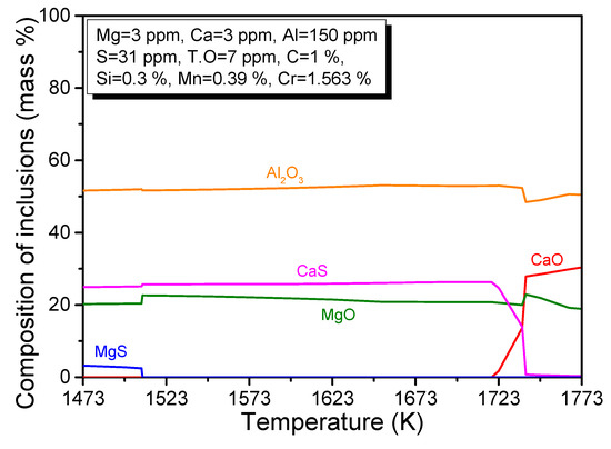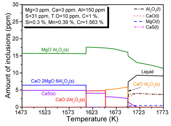 The comprehensive transformation of inclusions in the bearing steel at various temperatures considering the steel with 10 ppm T.O is quite different. Liquid oxides and solid MgO·Al2O3 form between 1717 K and 1773 K during the solidification of the steel when T.O content is 10 ppm, as shown in Figure 20. The amount of MgO·Al2O3 inclusions increases with the decrease of temperature. Solid CaS inclusions begin to precipitate at 1717 K. Solid CaO·Al2O3 inclusions generate and liquid phase disappears at 1698 K. As the temperature further decreases, solid CaO·2Al2O3 and CaO·2MgO·8Al2O3 precipitate successively, along with the disappearance of CaO·Al2O3 and CaO·2Al2O3 in succession. According to the calculated results above, it can be concluded that the steel composition has an important influence on the transformation of inclusions in the bearing steel during heat treatment.