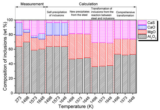During heat treatment in the temperature range of 1498 to 1648 K, the main equilibrium inclusion phases are solid CaS and MgO·Al2O3. By combining the content of each phase, the average composition of inclusions during heat treatment can be obtained, as shown in Figure 19. The CaO content of inclusions decreases to zero when the temperature decreases to 1719 K, and the CaS content in inclusions increases significantly. Moreover, the Al2O3 and MgO contents of inclusions vary slightly, indicating that the transformation from CaO into CaS in inclusions mainly occurs during heat treatment.