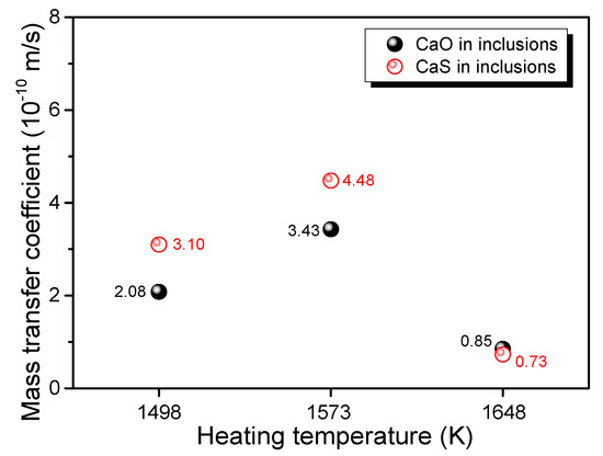 The mass percentage of in inclusions after a certain time of heat treatment and that at equilibrium state can be acquired from Figure 7, Figure 13, and Figure 14. As stated previously, the diameter of the inclusions can be regarded as the constant value, according to Figure 16. Thus, and at different temperatures are obtained as empirical parameters shown in Figure 23. At 1498 K and 1573 K, the mass transfer coefficient of CaS in inclusions is larger than that of CaO, and they are almost the same at 1648 K. In addition, the mass transfer coefficient of CaS (or CaO) in inclusions at 1573 K is larger than that of CaS (or CaO) at 1498 and 1648 K.
