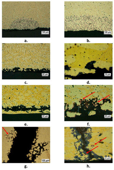 Forms of corrosion attack detected in failed components; (a) plug dezincification (F2 component); (b) layer dezincification (F6 component); (c) and (d): selective corrosion attack with dissolution of the β’ phase (F3 component); (e) (F2 component) and (f) (F7 component): subsurface corrosion and dezincification; (g) and (h): cracks, accompanied by dezincification (F7 component). Arrows in (f–h) indicate porous copper produced by dezincification.
