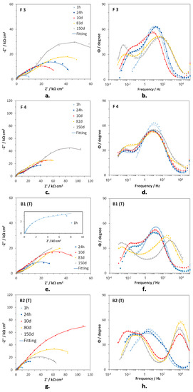 Figure 5a–h shows the EIS spectra of F3, F4, B1(T), and B2(T) in Nyquist and Bode (angle vs. frequency) forms, at specific immersion times. In F3 (Figure 5a,b) and F4 (Figure 5c,d), two time constants were detected at frequencies around 10 (medium frequency, mf, time constant) and 10−2 Hz (low frequency, LF, time constant). The latter time constant was just a hint in the Bode plots after 1 h immersion. On F4 a third time constant centered at about 104 Hz (high frequency, HF, time constant) occurred at long immersion times (82 and 150 days). In the case of B1(T) samples, again only the MF (102–10 Hz) and the LF (10−2–10−1 Hz) time constants were detected after 1 h, 24 h, and 10 days of immersion, but just the beginning of the LF one was present after 1 h.