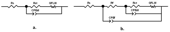The spectra were fitted with the equivalent circuits (ECs) reported in Figure 6a,b.