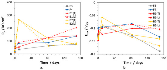 The polarization resistance values of the alloys, inversely proportional to the corrosion rates, were calculated as the sum: and are collected in Figure 7, together with the corresponding Ecor values. In general, the alloys exhibited low initial Rp values tending to increase with time. Only for B2(T), Rp reached a maximum (266 kΩ cm2) after 10 days of immersion, then decreased to rather low values (74.5 kΩ cm2), suggesting an important loss of corrosion resistance. Interestingly, the time evolution of Rp for B1(L) and B2(L) were similar to those of the corresponding (T) electrodes. In fact, also for B2(L), Rp passed through a maximum at 10 days and then decreased significantly. B1(L) exhibited slightly higher corrosion resistance than B1(T). F3 was the least corrosion resistant alloy (lowest Rp values), but at long immersion time the behavior of B2 electrodes overlapped that of F3. Between 80 and 150 days of exposure, the overall Rp variations among traditional and dealloying-resistant alloys were quite limited, that is the highest and lowest values differed by a factor of 2–2.7.