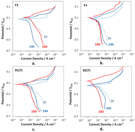 The polarization curves recorded on F3, F4, B2(T), and B3(T) after 1 h, 24 h, and 10 days of immersion in SDW are reported in Figure 8.