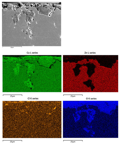 Figure 10 shows the SEM-EDS elemental mapping obtained on B1(T) cross sections. It confirms extensive oxidation of dezincified regions and reveals the penetration of chlorides well inside the dealloyed regions, with local concentrations up to 0.3 wt. %. Extensive plug dezincification of β’ phase was detected on F3 and F4, with maximum depths of about 170 and 100 µm, respectively. Chloride penetration and inner oxidation were detected as well.