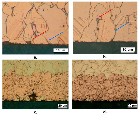 Sections of B2(T) (a,c) and B2(L) (b,d) samples after 10 days (a,b) and 150 days (c,d) of exposure to SDW. Surface etching by 10 wt. % FeCl3 solution evidences the location of corrosion attack initiation with reference to the alloy microstructure: corrosion starts in correspondence with the κ phase (red arrows) and along grain boundaries (blue arrows).