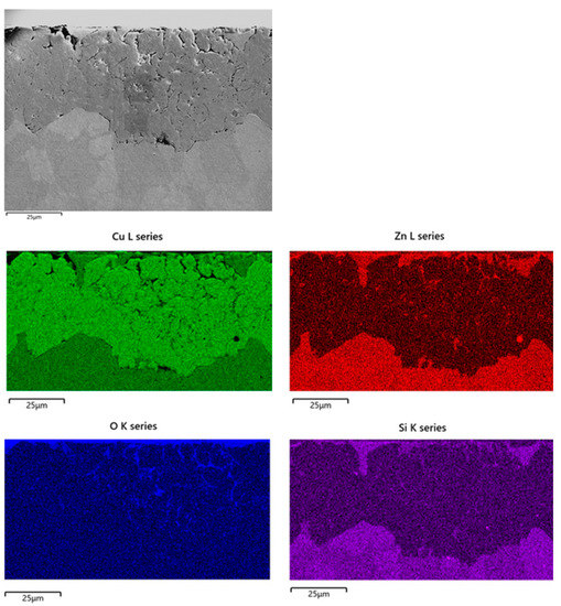 At longer immersion times (Figure 11c,d), uniform dezincified layers were observed (maximum thickness about 60 µm), affecting both κ and α phases, with morphology and penetration depth independent of exposed surface orientation. The SEM-EDS elemental map on the cross section of a B2(T) sample after 150 days immersion in SDW is reported in Figure 12. In this sample, dealloyed regions contained only copper, negligible amounts of oxygen and silicon, and no chlorides, suggesting that on this alloy selective corrosion produced rather compact copper regions.