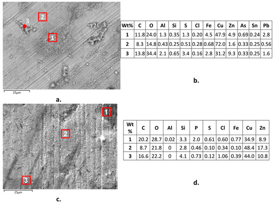 The SEM-EDS analyses of surface corrosion products on B1(T) specimens after 150 day immersions revealed the presence of significant surface arsenic concentrations (up to 0.69 wt. %), besides chlorine (up to 0.34 wt. %), oxygen, and sulfur (Figure 13a,b). This indicated the presence of surface chlorides, oxides, and perhaps sulfates and the incorporation of arsenate or arsenite among corrosion products [43]. On B2(T) (Figure 13c,d), SEM-EDS technique detected the same corrosion products (except arsenic species obviously), with addition of some silicates in agreement with literature information [16] and phosphates, as suggested by phosphorous concentrations up to 2.1 wt. %. Chloride concentrations reached 1.7 wt. %.