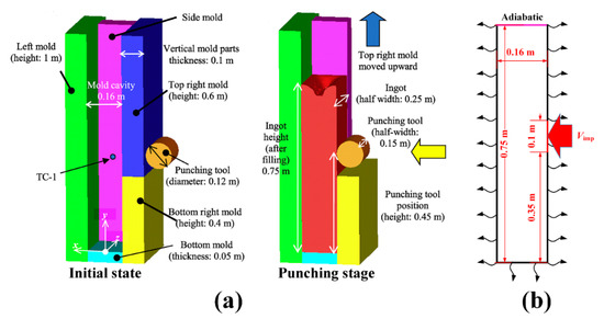 - Koshikawa, T.; Bellet, M.; Gandin, C.; Yamamura, H.; Bobadilla, M. Study of hot tearing during steel solidification through ingot punching test and its numerical simulation. Metall. Mater. Trans. A 2016, 47, 4053–4067. [Google Scholar] [CrossRef]