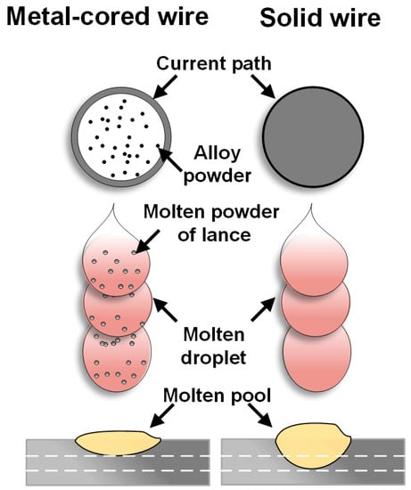 The advantages of metal-cored wires mentioned attracted the attention of many researchers and research institutions in the past two decades [,]. The studies indicate that metal-cored wires are a good alternative for additive manufacturing. Nevertheless, the application of only limited metal-cored wires in WAAM has been reported [,].