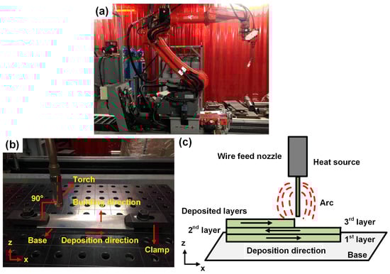 The deposition was carried out using a Panasonic robotic arm (Figure 2a) and a power source integrated by Valk Welding. The software used for designing the deposition tool path was Autodesk PowerMill (Autodesk B.V, Hoofddorp, The Netherlands). The experimental arrangement in this study is shown in Figure 2b, indicating the deposition direction, the build direction, and the positioning of the clamps. The torch was positioned perpendicular to the workpiece (PA position). The deposition strategy, i.e., reversing the deposition direction for each layer as shown in Figure 2c, was applied to avoid a height difference between the start and stop zones. A parametric experiment was carried out by ramping up the wire feed rate [] (4–8 m/min) to select optimal deposition conditions based on good bead appearance and an appropriate width to height ratio []. The reference deposition parameters used in this research are summarized in Table 2.