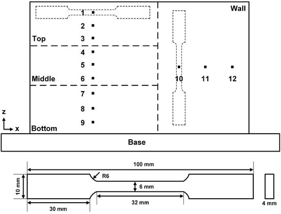 Schematic of the tensile test specimens extracted from the WAAM sample.