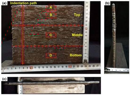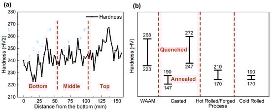 The variation of hardness along the vertical direction of the deposited wall is plotted in Figure 8a. In general, the deposited material undergoes several thermal cycles, which is expected to affect the hardness [,]. In the present case, the average measured hardness of bottom, middle, and top regions were 238 ± 8 HV, 243 ± 5 HV, and 250 ± 4 HV, respectively. The hardness of the top layers was slightly higher than the bottom layers because of the presence of non-equilibrium phases such as bainite and Widmanstätten ferrite, as seen in Figure 6a. The measured hardness (Figure 8a) showed that the fluctuation of hardness in the middle region was the smallest, while that of the top and bottom regions was higher. This indicated that the mechanical properties within the middle region were suspected to be more uniform.