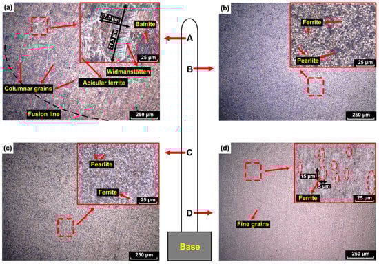 The microstructures observed by optical microscopy in regions B and C are shown in Figure 6b,c, respectively. From the entire of the two micrographs, it can be seen that the microstructure included ferrite (white) and pearlite (black). The microstructure, in general, became finer from the top to the bottom of the wall.