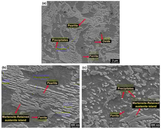 To have a clearer characterization of the microstructure, a higher resolution micrograph was taken by SEM at region C, which is shown in Figure 7. Some carbide precipitates and oxide particles (black spots in Figure 7a) were found in this region. The pearlite lamellae are shown in Figure 7b and the carbide precipitates are dispersed within the ferrite, as shown in Figure 7c. As seen in Figure 7b, the pearlite lamellae appeared to have thickened and contained edges. This was an indication that during reheating, the pearlite transformed into high carbon austenite, which then transformed to martensite during cooling. This was possible because of the high local hardenability of the carbon enriched austenite. The finest grains were observed in region D, as shown in Figure 6d. The grain size reduction was a result of the multiple thermal cycles experienced by the material. After the multiple thermal cycles, the ferrite and pearlite became finer. This could be proven by the measured maximum width and length of the prior austenite grains in region A and region D. The maximum width/length of the grain decreased from 37.5 µm/71.5 µm in region A to 5 µm/15 µm in region D. It can also be seen that the nucleation of ferrite occurred preferentially at prior columnar austenite grain boundaries.