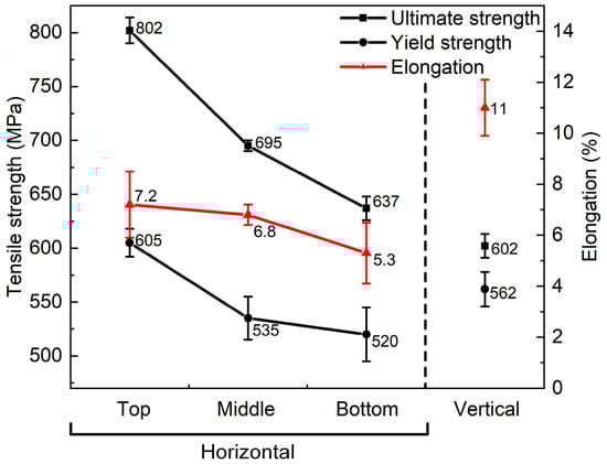 The measured yield and tensile strength together with the elongation of the samples prepared in different directions are summarized in Figure 9. The measurements showed that there was anisotropy in mechanical behavior within the WAAM deposited wall. The tests showed that both yield and ultimate strength decreased from the top to bottom layers. This was in agreement with the hardness profile shown in Figure 8a.