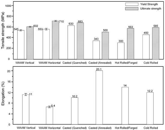 These average values of the WAAM deposited with XC-45 metal-cored wires were compared with the results of traditional metal processing (based on AISI 1045 steel) methods, which is shown in Figure 10. The yield strength and ultimate strength produced by WAAM were higher than most of the conventional manufacturing methods, while the elongation was lower. This corresponded well with the hardness results presented in Figure 8, which also shows that the average hardness in the quenched condition was higher than for the other techniques. In order to improve the ductility of the XC-45 WAAM deposited material, we considered additional post-deposition heat treatments to acquire the desired ductility. The possible heat treatments for XC-45 WAAM is a topic that was not covered in the current study.