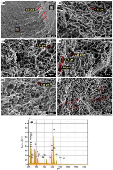 The particle (A) could be found inside the dimples. The existence of the metallic phases or oxides could promote the formation of dimples. Smaller dimples were probably related to the voids initiating at grain boundaries or other microstructural features. Larger dimples tended to nucleate at oxide particles []. Energy-dispersive X-ray spectroscopy (EDX) analyses were performed at particle A (Figure 11f) and the results are shown in Figure 11g. It can be seen that O, Fe, Mn, Cr, Si, and S were the main elements in particle A, which could be identified as either non-metallic inclusion, such as MnS [] or oxide.