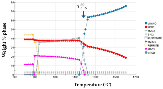 Calculated (JMatPro®) equilibrium phase composition of the coating material (Fe-19.48Cr-1.59Mn-16.68 Mo-2.33 O-1.49Si-6.64W-3.3B-0.97C, wt%) as a function of temperature.