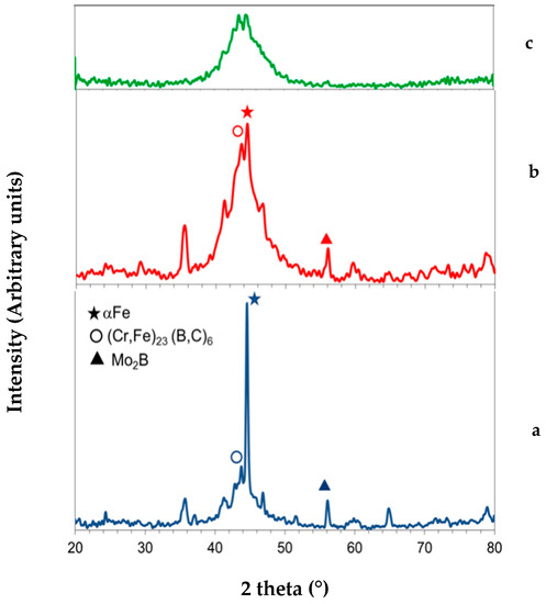 Figure 2 reports the calculated phase composition of the coating material, at thermodynamic equilibrium conditions, as a function of temperature. The chemical composition of the investigated material contained a very high amount of B and C; at the thermodynamic equilibrium, three main phases were present: metallic Fe (ferrite or austenite, depending on the temperature), borides, and carbides. Iron-based alloys with similar composition typically showed an improved glass-forming ability (GFA) correlated to the nucleation of complex crystalline structures as a product of the first crystallization processes, thus increasing the thermal stability of super-cooled liquid [27]. For example, the formation of M23C6 precipitates occurred by a complex multistep crystallization process: amorphous → long period structure → χ-FeCrMo phase → M23C6, the latter having a unit cell of 116 atoms and involving the ordering of large portions of the amorphous structure.