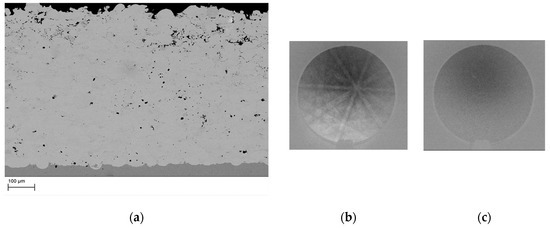 In the case of CGS-deposited coatings, the XRD pattern shows the typical features of an amorphous material (very broad and low peaks centered around theoretical positions). The amorphous nature of the coating was also confirmed by the EBSD analysis reported in Figure 4. The Kikuchi lines, generated by the scattering on the lattice planes, can be clearly identified in the crystalline substrate, while they are absent in the coating, thus proving its amorphous state. A layered amorphous microstructure was observed in the SEM cross-section of the CGS coating, shown in Figure 4a. The layered morphology was made of sprayed metallic particles partially flattened due to the combination of high-energy impact on the substrate and severe plastic deformation [29,30,31]. The powder particles’ temperature during cold spraying did not attain solidus temperature, and the primary cause of amorphization in the CGS-deposited coating was, therefore, the high-strain/strain-rate deformation with shear instability [32] (due to the particles’ high kinetic energy) rather than the rapid temperature decrease. It is well known that grain refinement up to nanocrystalline structures can be observed in materials submitted to a severe plastic deformation (SPD) process, such as e.g., accumulative roll bonding [33] or equal channel angular extrusion [34], where nanocrystalline structures are usually obtained. Also, in the case of CGS, the deformation on impact was so high as to completely destroy/avoid the crystalline structure, thus allowing the metastable formation of amorphous metals.