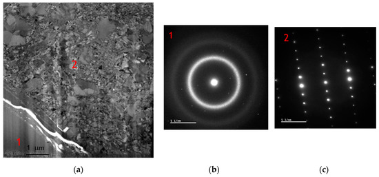 TEM image (a) and SAD patterns (b,c) of a CGS coating: 1. amorphous region; 2. crystallized region.