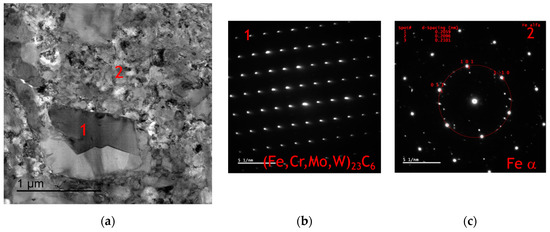 TEM image (a) and SAD patterns (b,c) in the crystallized region: 1. carbides; 2. Fe α.