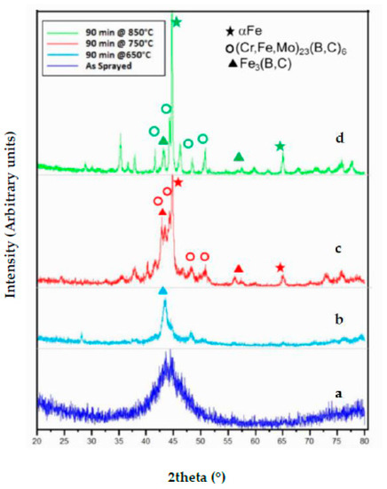 Figure 7 shows the XRD patterns of CGS coatings before and after heat treatments carried out at 650, 750, and 850 °C for 90 minutes.