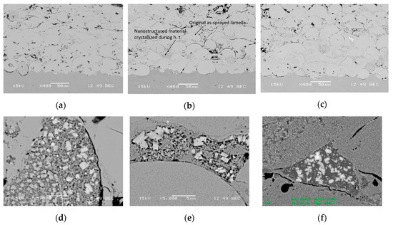 SEM micrographs of CGS coatings after Kalling’s etching: (a,d) heat-treated at 650 °C; (b,e) heat-treated at 750 °C; and (c,f) heat-treated at 850 °C for 90 min. Original rounded or flattened light-colored lamellae and dark-colored regions, crystallized during heat treatment, can be recognized.