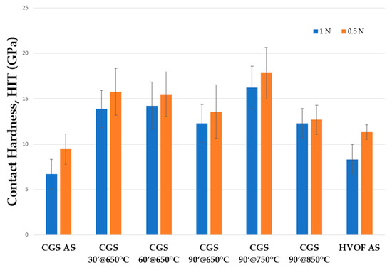 In Figure 9, contact hardness, measured with 0.5 and 1 N normal loads, of as-sprayed (HVOF and CGS) and heat-treated (CGS) coatings is reported. In the as-sprayed condition, HVOF coatings outperformed CGS deposits. This effect can be ascribed to the strengthening action of nanocrystalline domains and boundaries [28]. The same strengthening effect was observed on heat-treated CGS coatings, whose hardness increased for increasing temperatures in the range of 650–750 °C for shorter heat-treatment durations, and decreased again after prolonged treatment time or at higher exposure temperature, resulting in a sort of “over-aging” phenomenon. The observed phenomena can be explained on the basis of the well-known Hall-Petch [35] dependence-reversal effect [36], stating the existence of an optimal crystal size, usually of about a few tens of nm, corresponds to a peak hardness of the crystalline material.