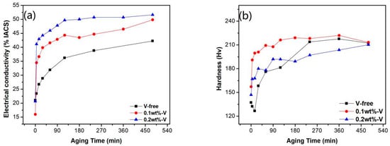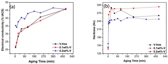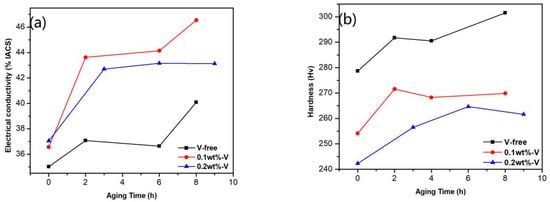 (a) Electrical conductivity and (b) hardness of the solution treatment samples with 0.1 wt.% V, 0.2 wt.% V and without V.