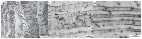 Figure 3 shows electrical conductivity and hardness of cold-rolled samples with 0.1 wt.% V, 0.2 wt.% V and without V (process 2). The electrical conductivity gradually increased during the aging process. The variation trend of electrical conductivity was similar to Figure 1a. Although the samples were aged for a long time, the electrical conductivity did not reach the peak value except for the samples with 0.1 wt.% V, and the other two groups did not show significant peak values. The electrical conductivity values of the samples with the addition of 0.2 wt.% V, 0.1 wt.% V and V-free were 51.64% IACS, 49.83% IACS, and 42.24% IACS at peak aging time. The hardness of the samples increased quickly at the beginning of aging time, and decreased after reaching the peak-aged values because of over-aging. The values of hardness approached 290.55 Hv, 293.88 Hv and 253.88 Hv for peak-aged samples with the addition of 0.2 wt.% V, 0.1 wt.% V and V-free. The time to reach the peak-aged hardness was shortened, and hardness decreased slightly during over-aging due to the addition of vanadium. Figure 4 shows the micrographs of Cu-1.6Ni-1.2Co-0.65Si(-V) alloys aged at 500 °C for 240 min after cold rolling. The grains were elongated due to cold rolling and the microstructure was highly oriented, but the microstructure was heterogenous due to cold rolling.
