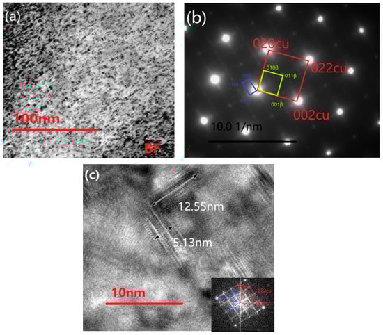 Figure 9 shows the TEM micrographs and HRTEM image of the samples with the addition of 0.1 wt.% V aged at 500 °C for 16 h. Figure 9a shows that the δ-(Co,Ni)2Si and β-Ni3Si particles are significantly coarsened and the dislocation entanglement still exist. The dislocation density obviously decreased because the precipitation nucleation required absorbing energy. Figure 9b shows that the δ-(Co,Ni)2Si precipitates have mutually perpendicular growth directions, and they significantly increase in size (Figure 6a). The dimensions of the precipitates were 16–17 nm (Figure 9c), which is bigger than in Figure 6c (aged for 240 min). The dimensions of the precipitates increased slightly during the aging process. The SADP image had no significant changes. The spots of copper matrix, δ-(Co,Ni)2Si and β-Ni3Si precipitates could be detected.