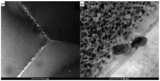 We examined the microstructure, precipitation behavior and morphology of samples treated by solution treatment. Figure 6 shows the TEM micrographs and HRTEM image of the samples with the addition of 0.1 wt.% V aged at 500 °C for 240 min. Figure 6a shows Ni and Si solute atoms are precipitated from supersaturated solid solution. The precipitates were evenly distributed in the field of view and observed the dislocation tangles in the sample. Figure 6b gives the selected-area diffraction patterns (SADP) of the alloy. SADP shows δ-(Co,Ni)2Si and β-Ni3Si phase are the contributor of diffraction spots. These were consistent with the results reported in reference [,,]. Figure 6c shows that the HRTEM images with the dimension of the disk-like precipitates is 12–13 nm. Figure 7 shows the TEM images of disk-like precipitates in the Cu-1.6Ni-1.2Co-0.65Si-0.1V alloy aged at 500 °C for 240 min. After aging for 240 min, δ-(Co,Ni)2Si precipitates were observed along the grain boundaries, but not in the copper matrix.